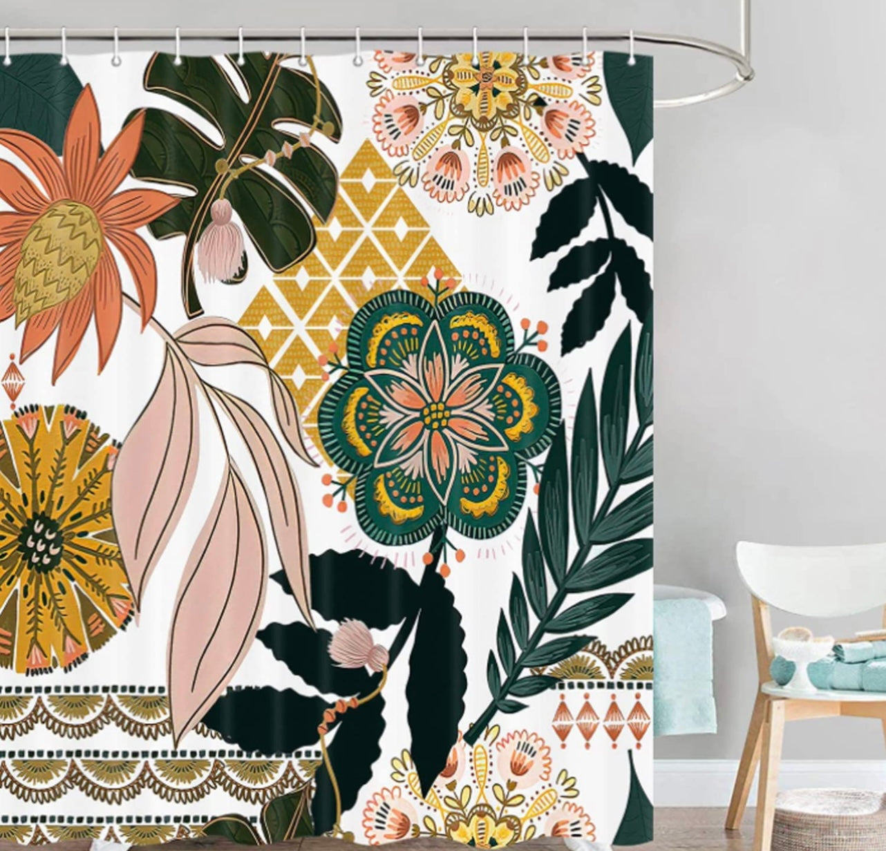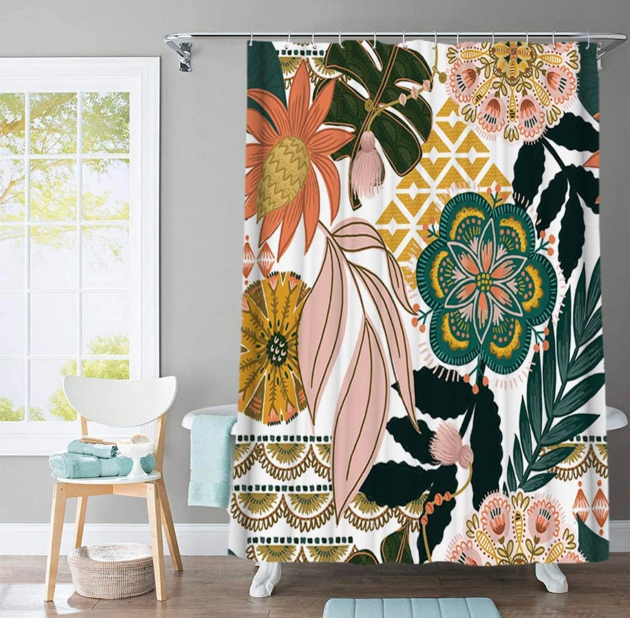 Boho Floral Shower Curtain (72” x 72”), Flower Tropical Leaves Shower Curtains, Polyester Fabric Printed Shower Curtain Set for Bathroom with Hooks (03)