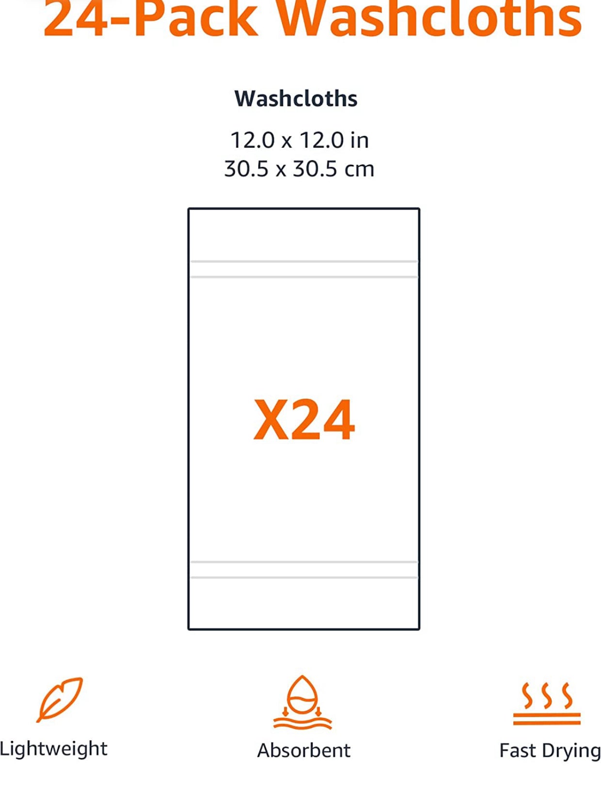 Fast Drying, Extra Absorbent, Terry Cotton Washcloths - Pack of 24, White, 12 x 12-Inch