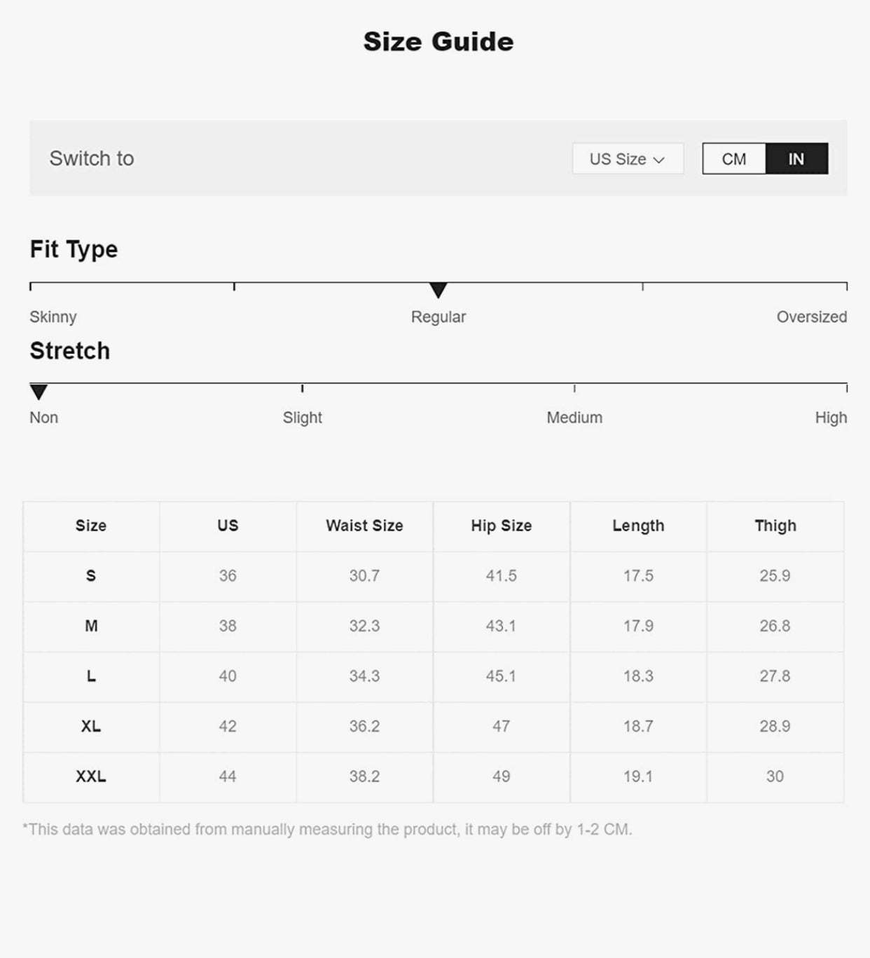 Small——Waist Size:26.8-41.7", Hip Size:47.2", Length:19.3", Thigh:28.3"/ Medium——Waist Size:28.3-43.3", Hip Size:48.8", Length:19.7", Thigh:29.1"/ Large——Waist Size:30.3-45.3", Hip Size:50.8", Length:20.1", Thigh:30.2"/ X-Large——Waist Size:32.3-47.2", Hip Size:52.8", Length:20.5", Thigh:31.3"/