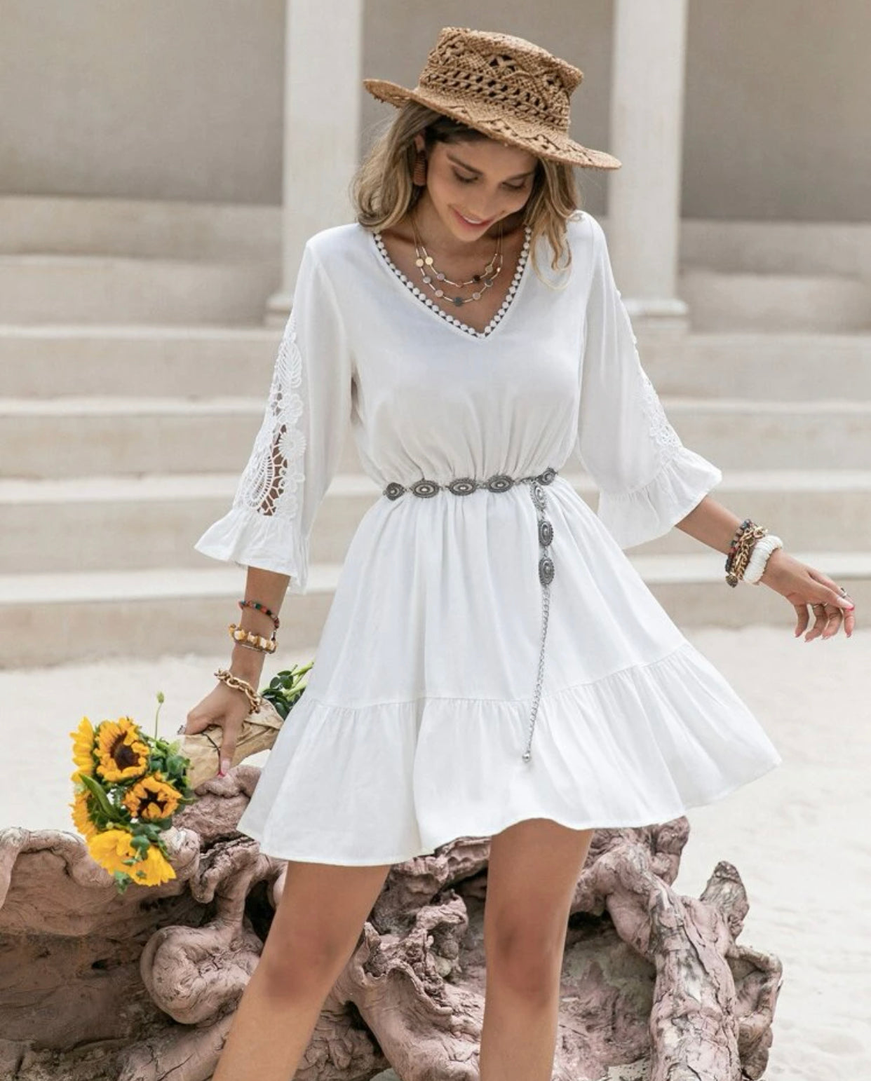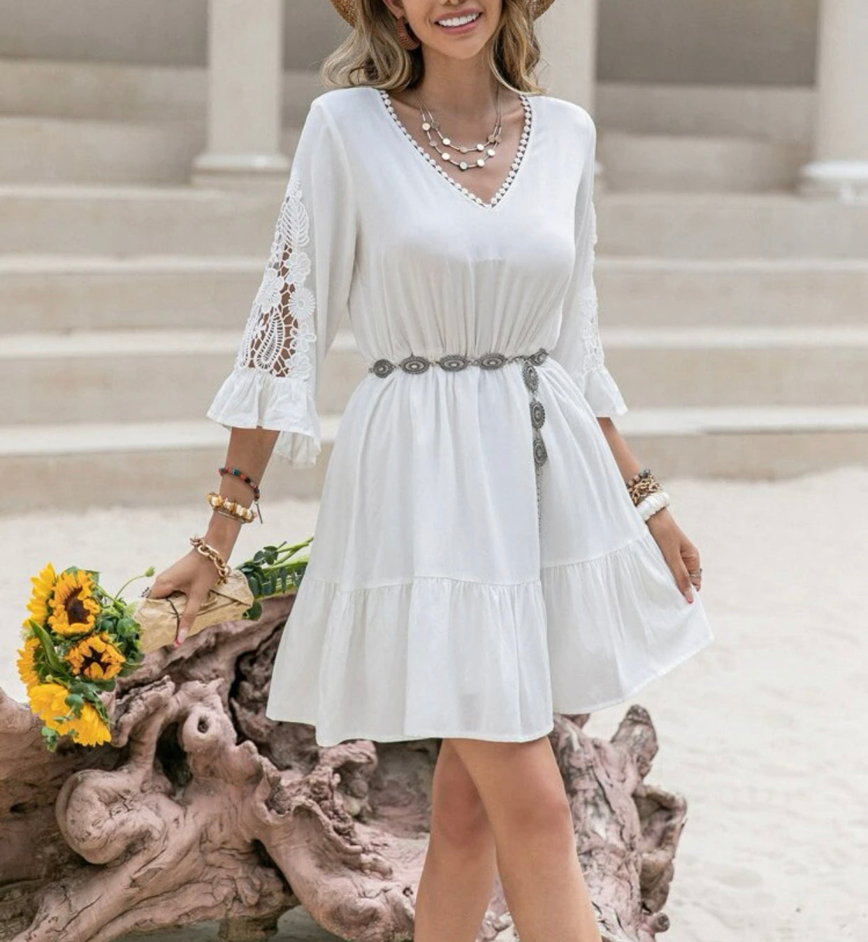 White contrast guipure lace flounce sleeve ruffle hem dress without belt