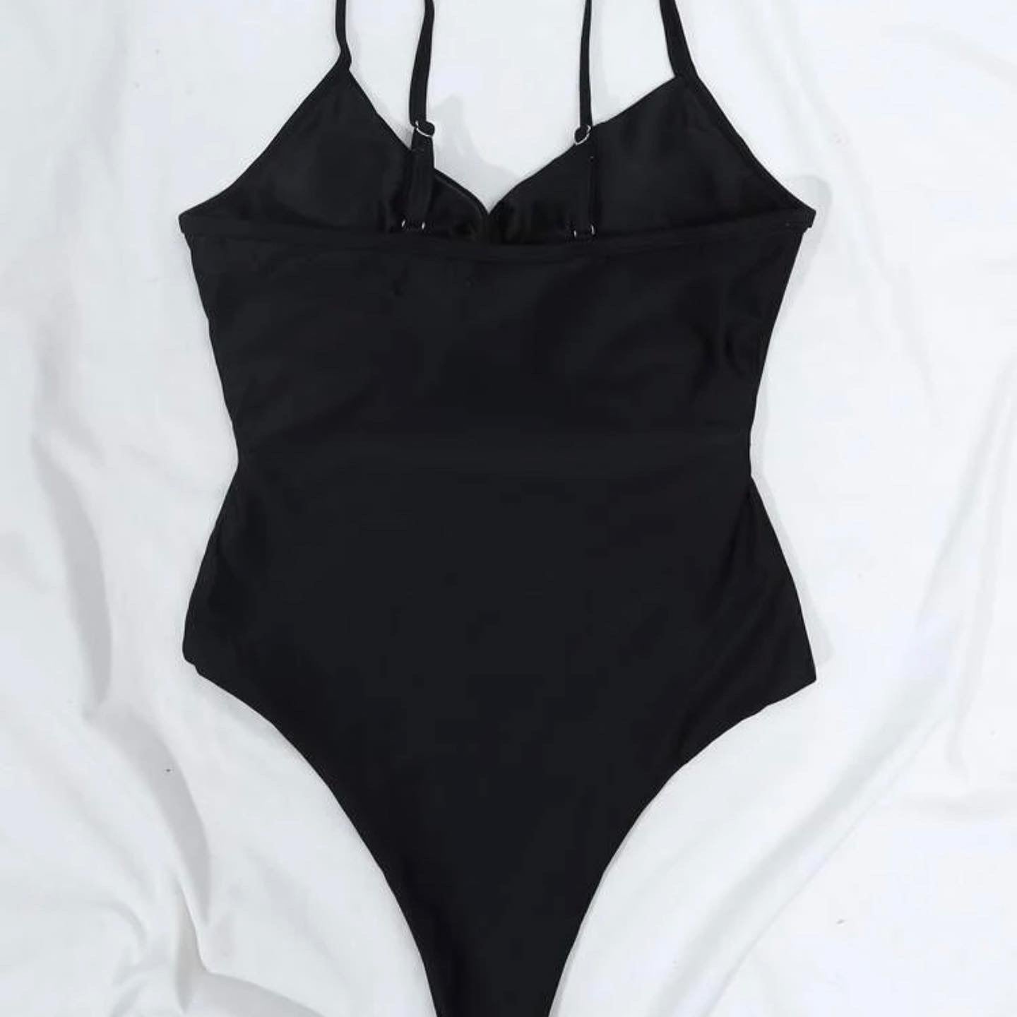 Gorgeous bow tie or knotted detail black strappy cut-out one piece swimsuit is lined and comfortable.
